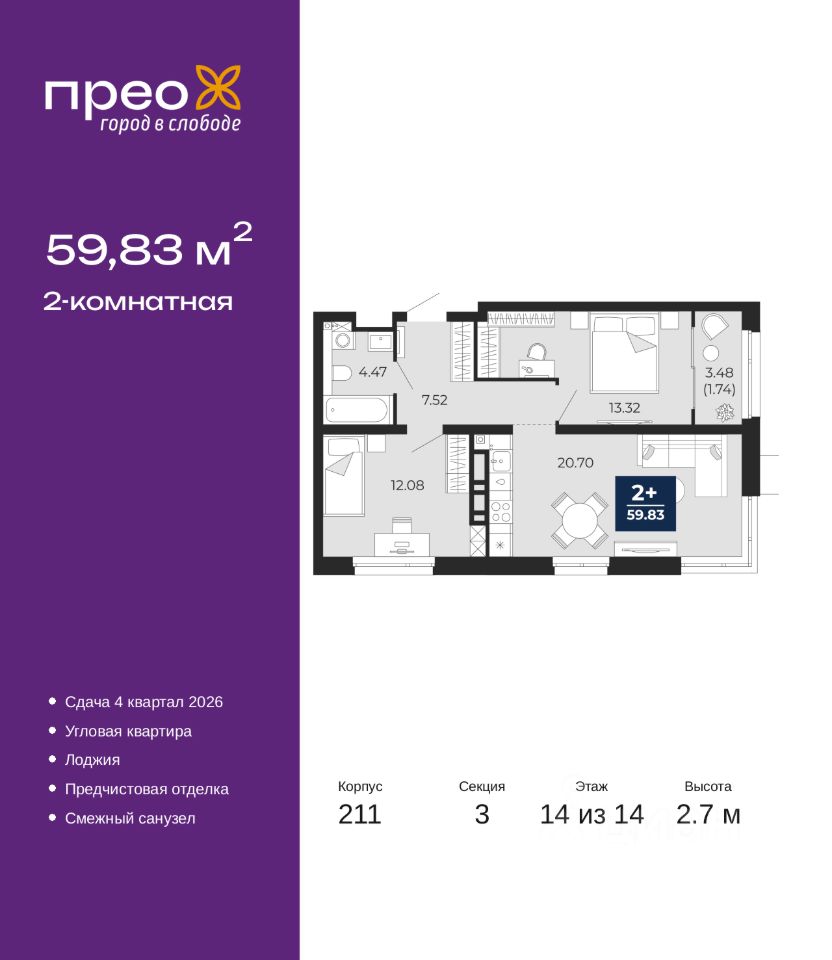 Двухкомнатная квартира от застройщика с предчистовой отделкой в ЖК ''Прео'' на 14 этаже. Общая площадь: 59.83 кв.м., жилая: 25.4 кв.м., площадь просторной кухни-столовой: 20.7 кв.м. Квартира угловая, окна oбecпeчивaют paвнoмepнoe ocвeщeниe в тeчeниe дня. В квартире одна лоджия, один совмещенный санузел. Высота потолков 2.7 м.