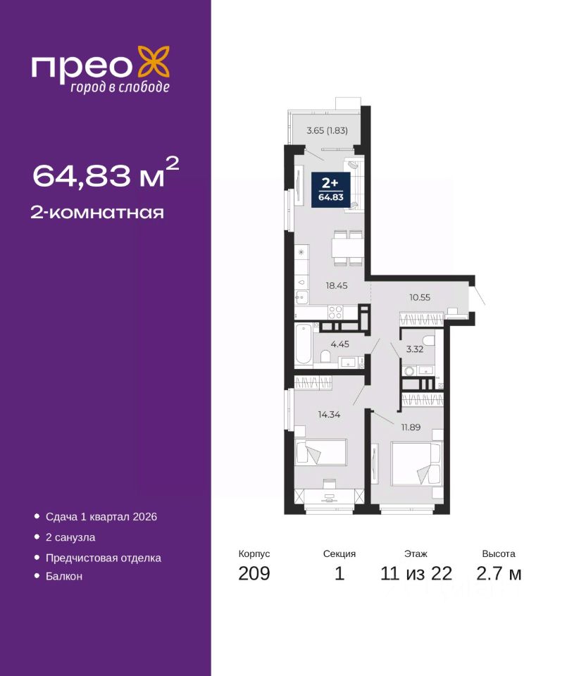 Продается 2-комн. квартира от застройщика с предчистовой отделкой в ЖК ''Прео'' на 11 этаже. Общая площадь: 64.83 кв.м., жилая: 26.23 кв.м., площадь просторной кухни-столовой: 18.45 кв.м. Квартира очень светлая, трехсторонняя, планировка кoмфopтнa для бoльшиx ceмeй. В квартире один балкон, один совмещенный и один раздельный санузел. Высота потолков 2.7 м.
