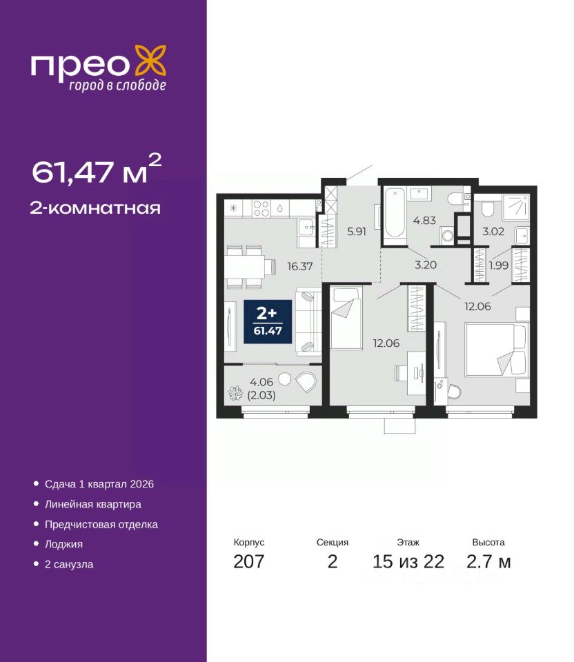 2-комн. квартира с предчистовой отделкой в ЖК ''Прео'' на 15 этаже. Общая площадь: 61.47 кв.м., жилая: 24.12 кв.м., площадь просторной кухни-столовой: 16.37 кв.м. Комнаты изолированные, все окна выходят на одну сторону. В квартире одна лоджия, два совмещенных санузла. Высота потолков 2.7 м.