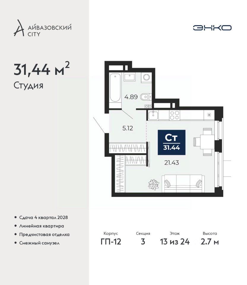 Продается 1-комн. квартира-студия с предчистовой отделкой в ЖК ''Айвазовский City'' на 13 этаже. Общая площадь: 31.44 кв.м., площадь гостиной 21.43 кв.м., из которых 5 кв.м. выделено под кухонную зону. Все окна выходят на одну сторону. В квартире один совмещенный санузел. Высота потолков 2.7 м.