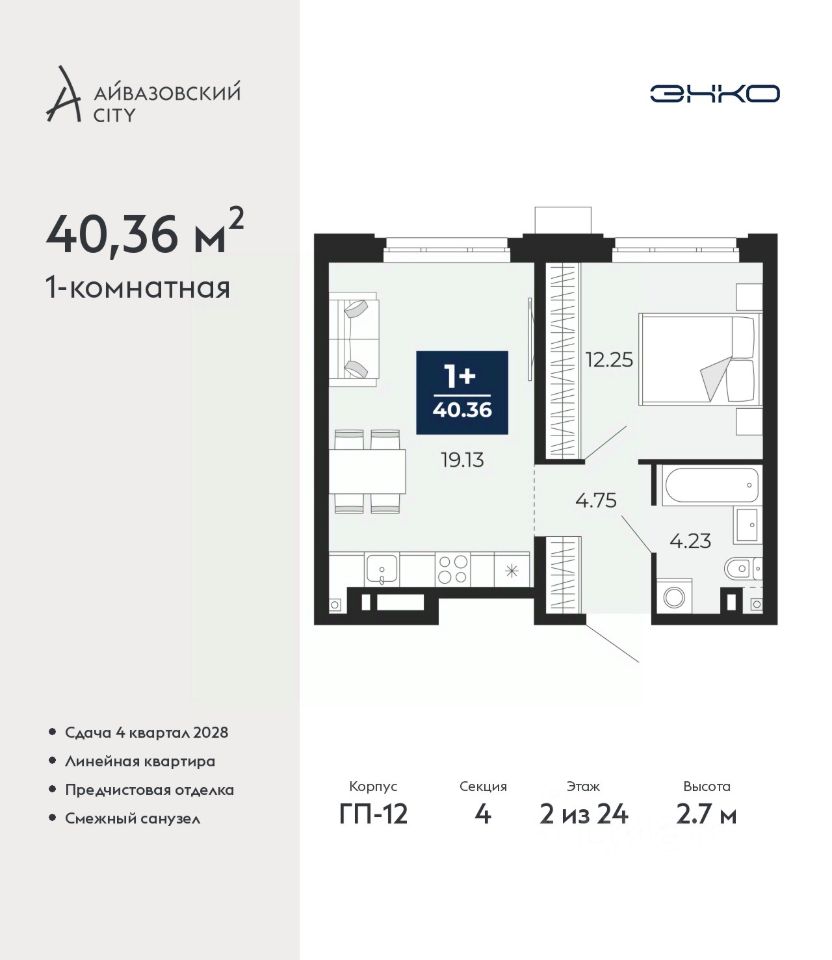 Продается однокомнатная квартира от застройщика с предчистовой отделкой в ЖК ''Айвазовский City'' на 2 этаже. Общая площадь: 40.36 кв.м., жилая: 12.25 кв.м., площадь просторной кухни-столовой: 19.13 кв.м. Все окна выходят на одну сторону. В квартире один совмещенный санузел. Высота потолков 2.7 м.