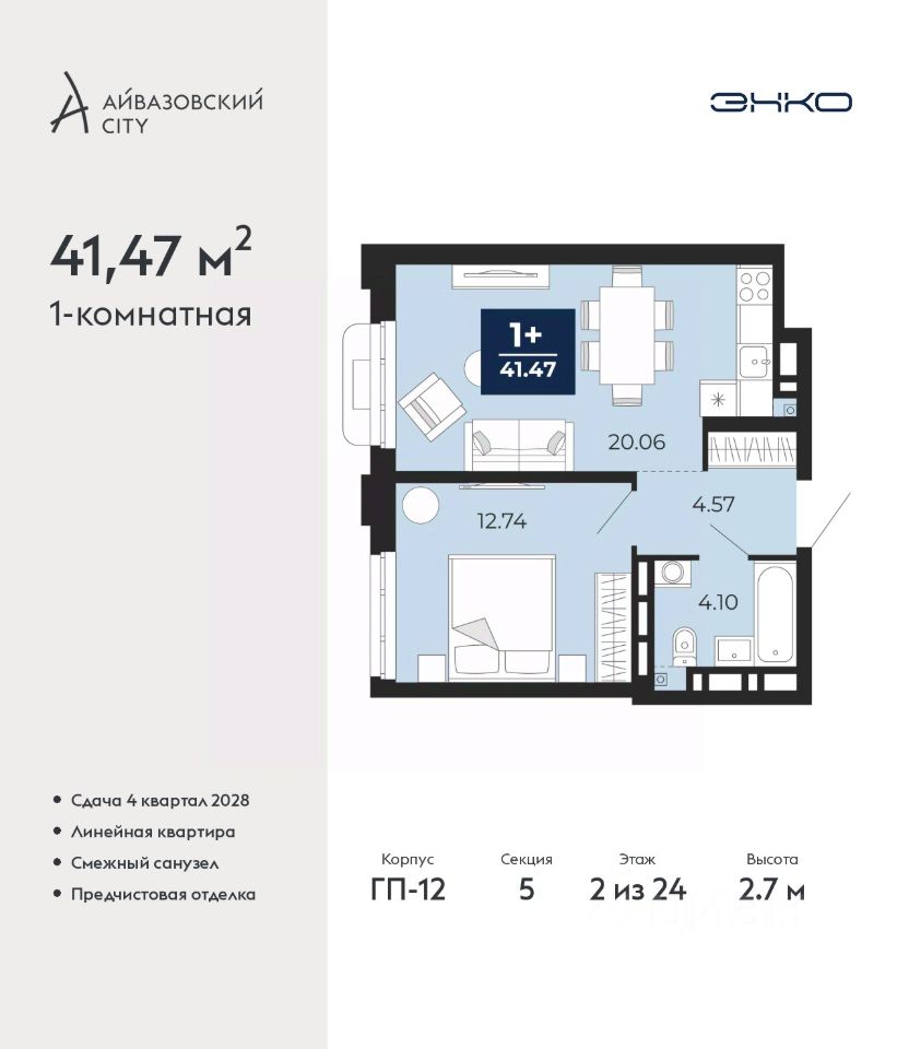 Однокомнатная квартира от застройщика с предчистовой отделкой в ЖК ''Айвазовский City'' на 2 этаже. Общая площадь: 41.47 кв.м., жилая: 12.74 кв.м., площадь просторной кухни-столовой: 20.06 кв.м. Все окна выходят на одну сторону. В квартире один совмещенный санузел. Высота потолков 2.7 м.