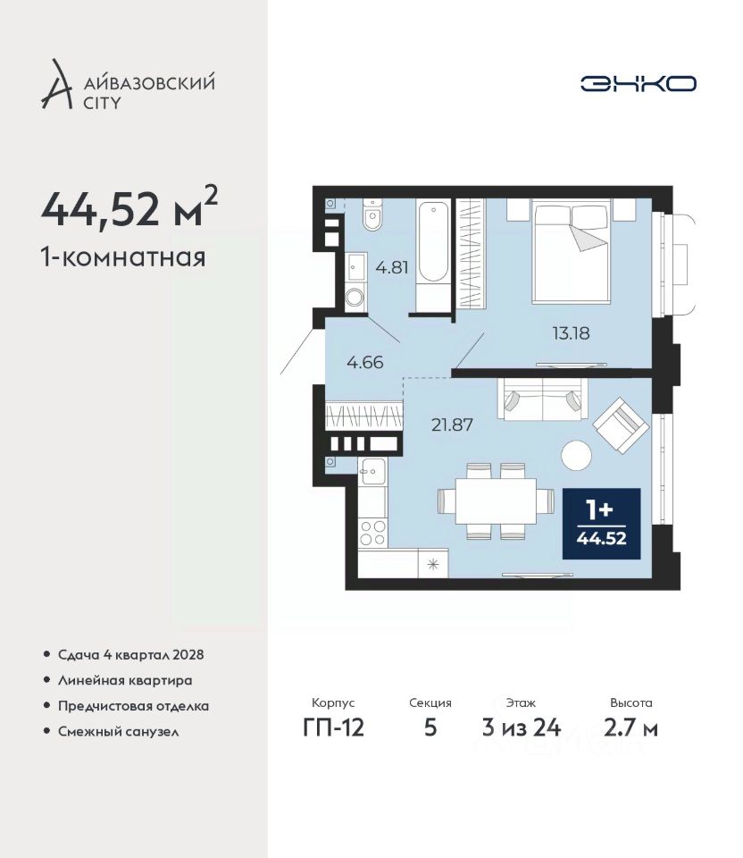 Просторная 1-комн. квартира с предчистовой отделкой в ЖК ''Айвазовский City'' на 3 этаже. Общая площадь: 44.52 кв.м., жилая: 13.18 кв.м., площадь просторной кухни-столовой: 21.87 кв.м. Все окна выходят на одну сторону. В квартире один совмещенный санузел. Высота потолков 2.7 м.