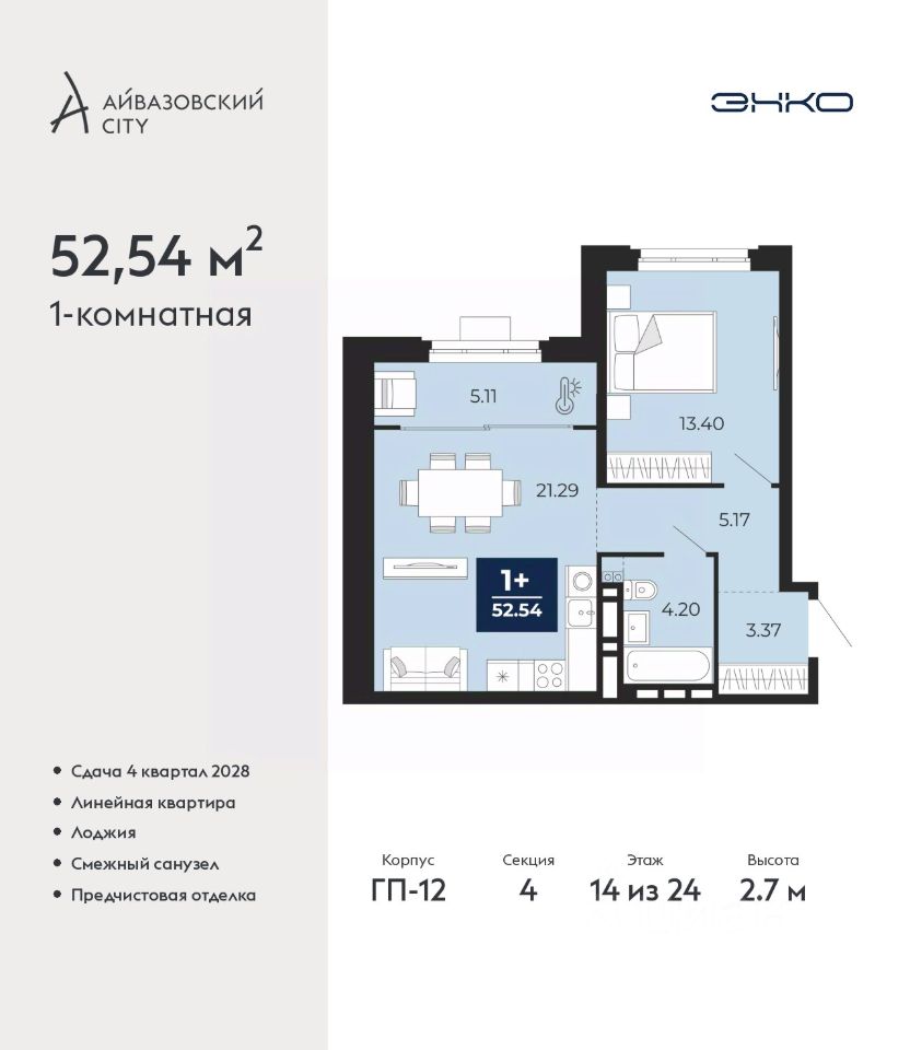 Однокомнатная квартира с предчистовой отделкой в ЖК ''Айвазовский City'' на 14 этаже. Общая площадь: 52.54 кв.м., жилая: 13.4 кв.м., площадь просторной кухни-столовой: 21.29 кв.м. Все окна выходят на одну сторону. В квартире одна лоджия, один совмещенный санузел. Высота потолков 2.7 м.