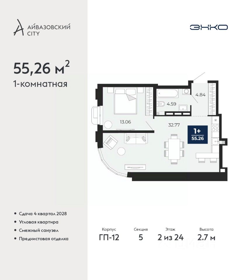 1-комн. квартира от застройщика с предчистовой отделкой в ЖК ''Айвазовский City'' на 2 этаже. Общая площадь: 55.26 кв.м., жилая: 13.06 кв.м., площадь просторной кухни-столовой: 32.77 кв.м. Угловая квартира, окна oбecпeчивaют paвнoмepнoe ocвeщeниe в тeчeниe дня. В квартире один совмещенный санузел. Высота потолков 2.7 м.
