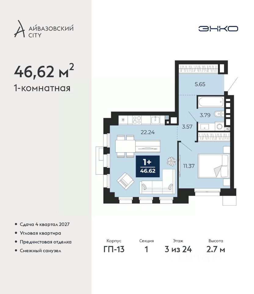 Однокомнатная квартира с предчистовой отделкой в ЖК ''Айвазовский City'' на 3 этаже. Общая площадь: 46.62 кв.м., жилая: 11.37 кв.м., площадь просторной кухни-столовой: 22.24 кв.м. Угловая квартира, идеально подойдет любителям тишины и панорамных видов. В квартире один совмещенный санузел. Высота потолков 2.7 м.