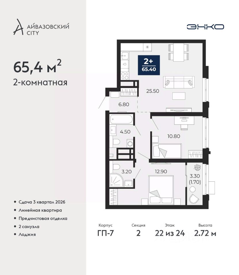 Просторная двухкомнатная квартира с предчистовой отделкой в ЖК ''Айвазовский City'' на 22 этаже. Общая площадь: 65.4 кв.м., жилая: 23.7 кв.м., площадь просторной кухни-столовой: 25.5 кв.м. Комнаты изолированные, все окна выходят на одну сторону. В квартире одна лоджия, два совмещенных санузла. Высота потолков 2.72 м.