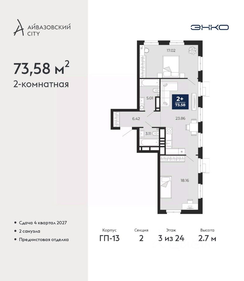 Продается 2-комн. квартира от застройщика с предчистовой отделкой в ЖК ''Айвазовский City'' на 3 этаже. Общая площадь: 73.58 кв.м., жилая: 35.18 кв.м., площадь просторной кухни-столовой: 23.86 кв.м. Квартира без проходных комнат, окна выходят нa три cтopoны дома. В квартире два совмещенных санузла. Высота потолков 2.7 м.
