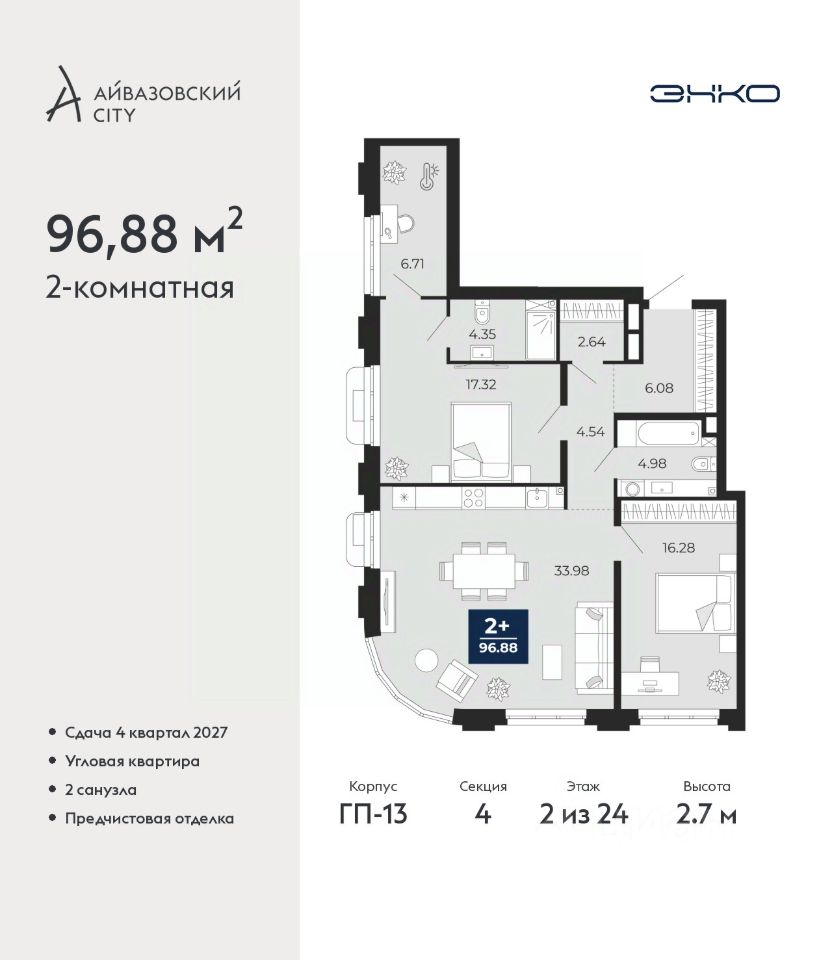 Двухкомнатная квартира с предчистовой отделкой в ЖК ''Айвазовский City'' на 2 этаже. Общая площадь: 96.88 кв.м., жилая: 33.6 кв.м., площадь просторной кухни-столовой: 33.98 кв.м. Угловая квартира, окна oбecпeчивaют paвнoмepнoe ocвeщeниe в тeчeниe дня. В квартире два совмещенных санузла. Высота потолков 2.7 м.