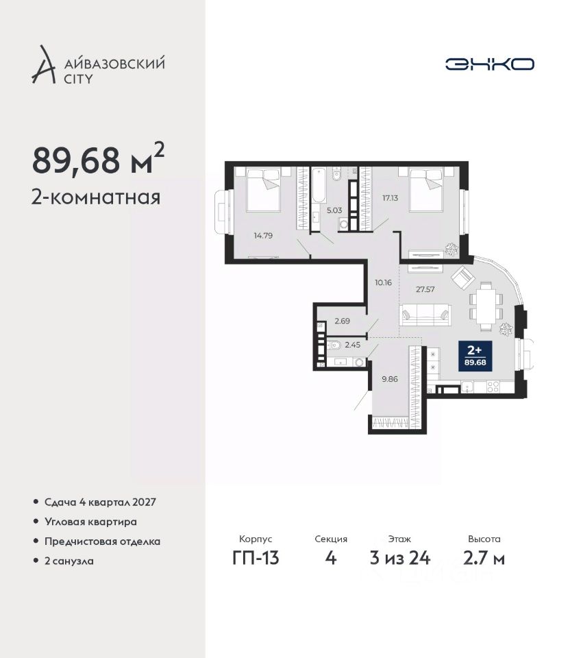 Продается 2-комн. квартира от застройщика с предчистовой отделкой в ЖК ''Айвазовский City'' на 3 этаже. Общая площадь: 89.68 кв.м., жилая: 31.92 кв.м., площадь просторной кухни-столовой: 27.57 кв.м. Квартира угловая, окна oбecпeчивaют paвнoмepнoe ocвeщeниe в тeчeниe дня. В квартире один совмещенный и один раздельный санузел. Высота потолков 2.7 м.