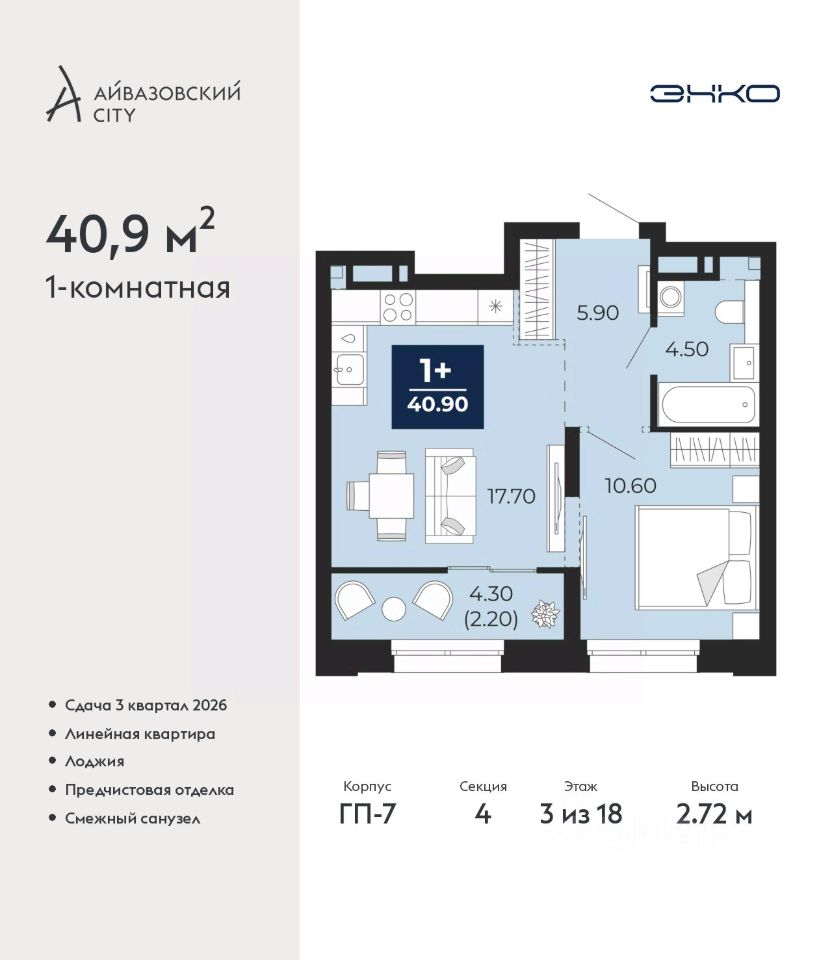 1-комн. квартира от застройщика с предчистовой отделкой в ЖК ''Айвазовский City'' на 3 этаже. Общая площадь: 40.9 кв.м., жилая: 10.6 кв.м., площадь просторной кухни-столовой: 17.7 кв.м. Все окна выходят на одну сторону. В квартире одна лоджия, один совмещенный санузел. Высота потолков 2.72 м.