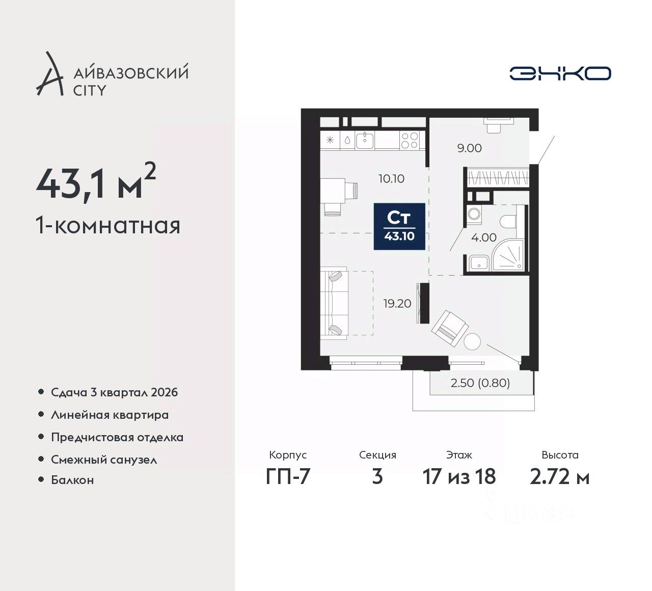 Продается 1-комн. квартира с предчистовой отделкой в ЖК ''Айвазовский City'' на 17 этаже. Общая площадь: 43.1 кв.м., жилая: 19.2 кв.м., площадь просторной кухни-столовой: 10.1 кв.м. Все окна выходят на одну сторону. В квартире один балкон, один совмещенный санузел. Высота потолков 2.72 м.