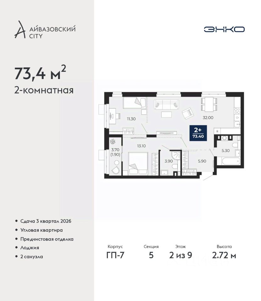 2-комн. квартира с предчистовой отделкой в ЖК ''Айвазовский City'' на 2 этаже. Общая площадь: 73.4 кв.м., жилая: 24.4 кв.м., площадь просторной кухни-столовой: 32 кв.м. Квартира угловая, идеально подойдет любителям тишины и панорамных видов. В квартире одна лоджия, два совмещенных санузла. Высота потолков 2.72 м.