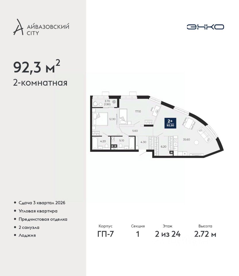 Продается двухкомнатная квартира с предчистовой отделкой в ЖК ''Айвазовский City'' на 2 этаже. Общая площадь: 92.3 кв.м., жилая: 29.4 кв.м., площадь просторной кухни-столовой: 35.6 кв.м. Квартира угловая, идеально подойдет любителям тишины и панорамных видов. В квартире одна лоджия, два совмещенных санузла. Высота потолков 2.72 м.