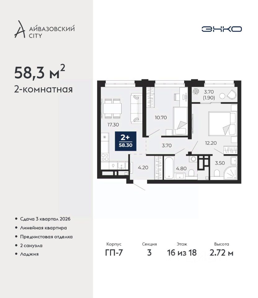Двухкомнатная квартира с предчистовой отделкой в ЖК ''Айвазовский City'' на 16 этаже. Общая площадь: 58.3 кв.м., жилая: 22.9 кв.м., площадь просторной кухни-столовой: 17.3 кв.м. Комнаты изолированные, все окна выходят на одну сторону. В квартире одна лоджия, два совмещенных санузла. Высота потолков 2.72 м.