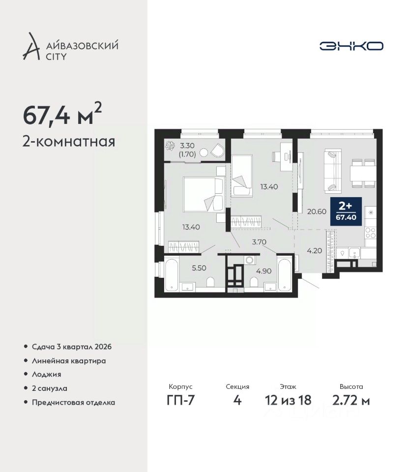 Двухкомнатная квартира от застройщика с предчистовой отделкой в ЖК ''Айвазовский City'' на 12 этаже. Общая площадь: 67.4 кв.м., жилая: 26.8 кв.м., площадь просторной кухни-столовой: 20.6 кв.м. Комнаты изолированные, все окна выходят на одну сторону. В квартире одна лоджия, два совмещенных санузла. Высота потолков 2.72 м.