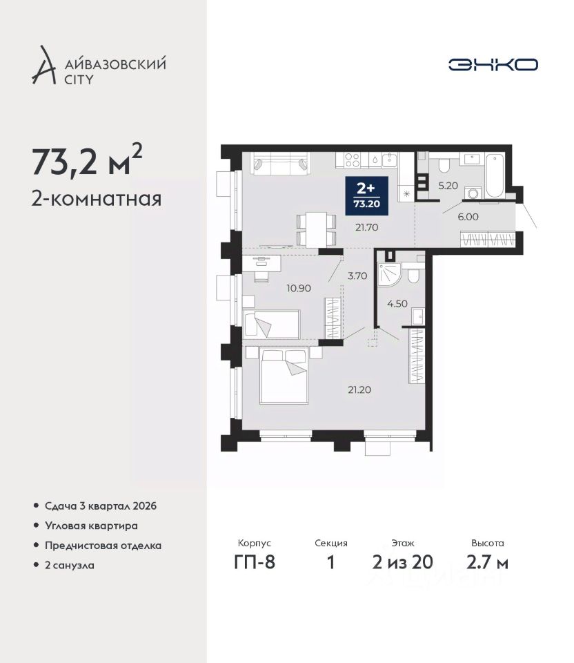 Просторная двухкомнатная квартира с предчистовой отделкой в ЖК ''Айвазовский City'' на 2 этаже. Общая площадь: 73.2 кв.м., жилая: 32.1 кв.м., площадь просторной кухни-столовой: 21.7 кв.м. Квартира угловая, очень светлая, естественная вентиляция при открытии окон. В квартире два совмещенных санузла. Высота потолков 2.7 м.