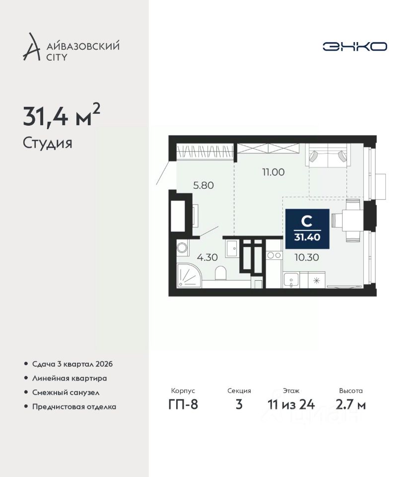 Просторная однокомнатная квартира-студия с предчистовой отделкой в ЖК ''Айвазовский City'' на 11 этаже. Общая площадь: 31.4 кв.м., площадь гостиной 21.3 кв.м., из которых 10.3 кв.м. выделено под кухонную зону. Все окна выходят на одну сторону. В квартире один совмещенный санузел. Высота потолков 2.7 м.