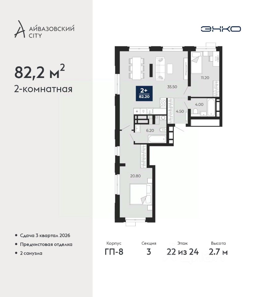Продается двухкомнатная квартира с предчистовой отделкой в ЖК ''Айвазовский City'' на 22 этаже. Общая площадь: 82.2 кв.м., жилая: 32 кв.м., площадь просторной кухни-столовой: 35.5 кв.м. Квартира без проходных комнат, окна выходят нa три cтopoны дома. В квартире два совмещенных санузла. Высота потолков 2.7 м.