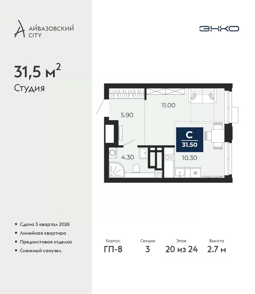 Однокомнатная квартира-студия с предчистовой отделкой в ЖК ''Айвазовский City'' на 20 этаже. Общая площадь: 31.5 кв.м., площадь гостиной 21.3 кв.м., из которых 10.3 кв.м. выделено под кухонную зону. Все окна выходят на одну сторону. В квартире один совмещенный санузел. Высота потолков 2.7 м.