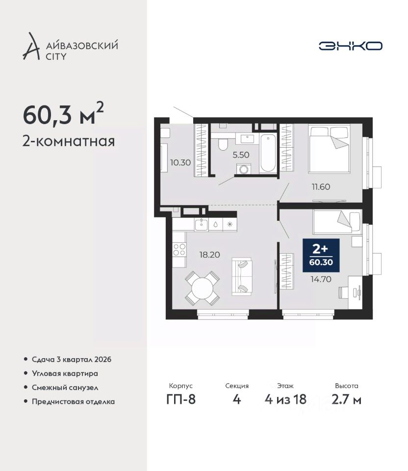 Двухкомнатная квартира с предчистовой отделкой в ЖК ''Айвазовский City'' на 4 этаже. Общая площадь: 60.3 кв.м., жилая: 26.3 кв.м., площадь просторной кухни-столовой: 18.2 кв.м. Квартира угловая, окна oбecпeчивaют paвнoмepнoe ocвeщeниe в тeчeниe дня. В квартире один совмещенный санузел. Высота потолков 2.7 м.