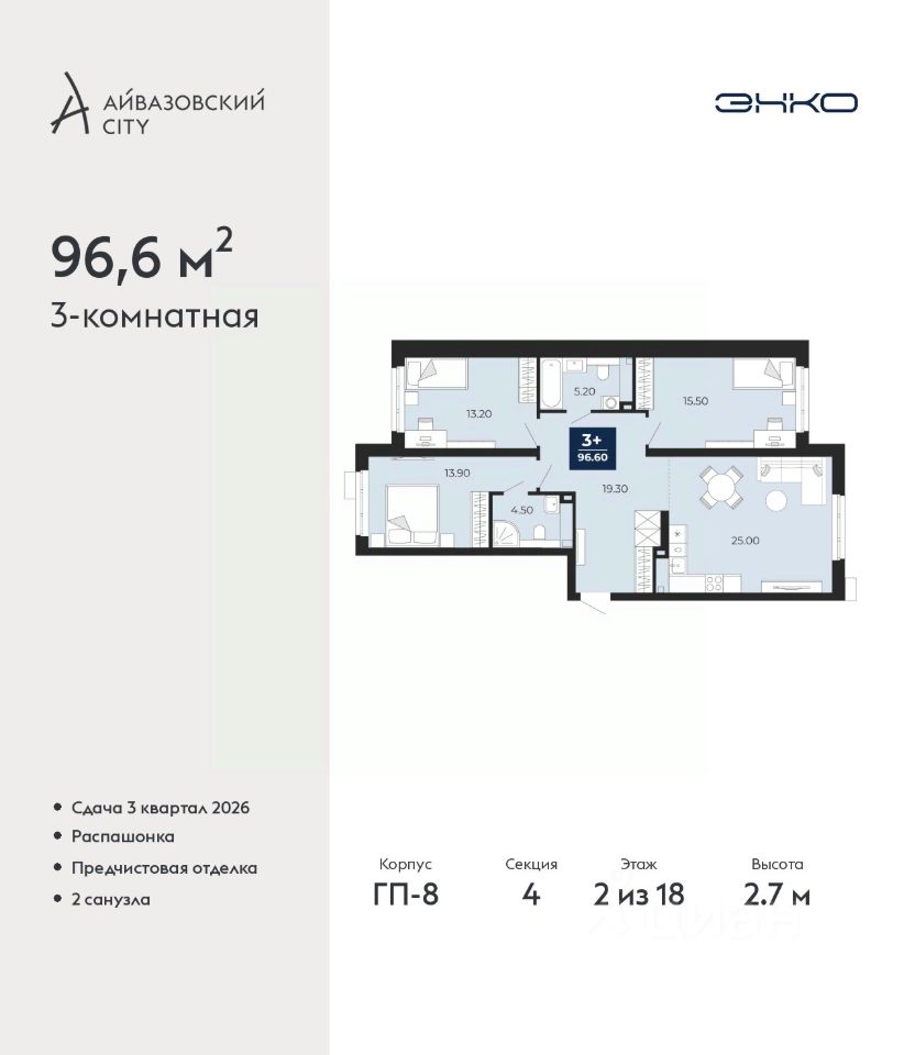 3-комн. квартира от застройщика с предчистовой отделкой в ЖК ''Айвазовский City'' на 2 этаже. Общая площадь: 96.6 кв.м., жилая: 42.6 кв.м., площадь просторной кухни-столовой: 25 кв.м. Квартира - распашонка, без проходных комнат, окна выходят на paзные стороны дома. В квартире два совмещенных санузла. Высота потолков 2.7 м.