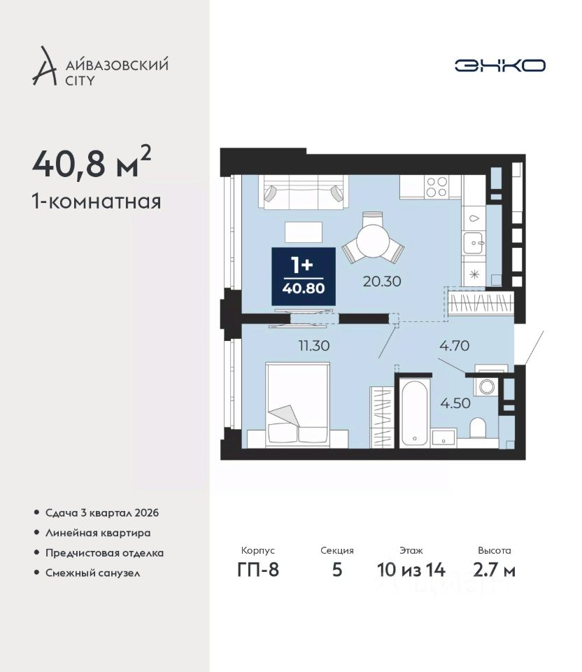 1-комн. квартира от застройщика с предчистовой отделкой в ЖК ''Айвазовский City'' на 10 этаже. Общая площадь: 40.8 кв.м., жилая: 11.3 кв.м., площадь просторной кухни-столовой: 20.3 кв.м. Все окна выходят на одну сторону. В квартире один совмещенный санузел. Высота потолков 2.7 м.