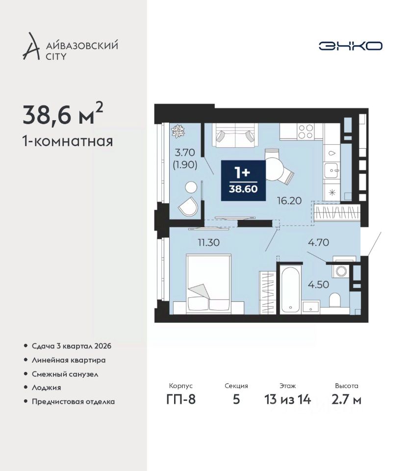 Продается 1-комн. квартира от застройщика с предчистовой отделкой в ЖК ''Айвазовский City'' на 13 этаже. Общая площадь: 38.6 кв.м., жилая: 11.3 кв.м., площадь просторной кухни-столовой: 16.2 кв.м. Все окна выходят на одну сторону. В квартире одна лоджия, один совмещенный санузел. Высота потолков 2.7 м.