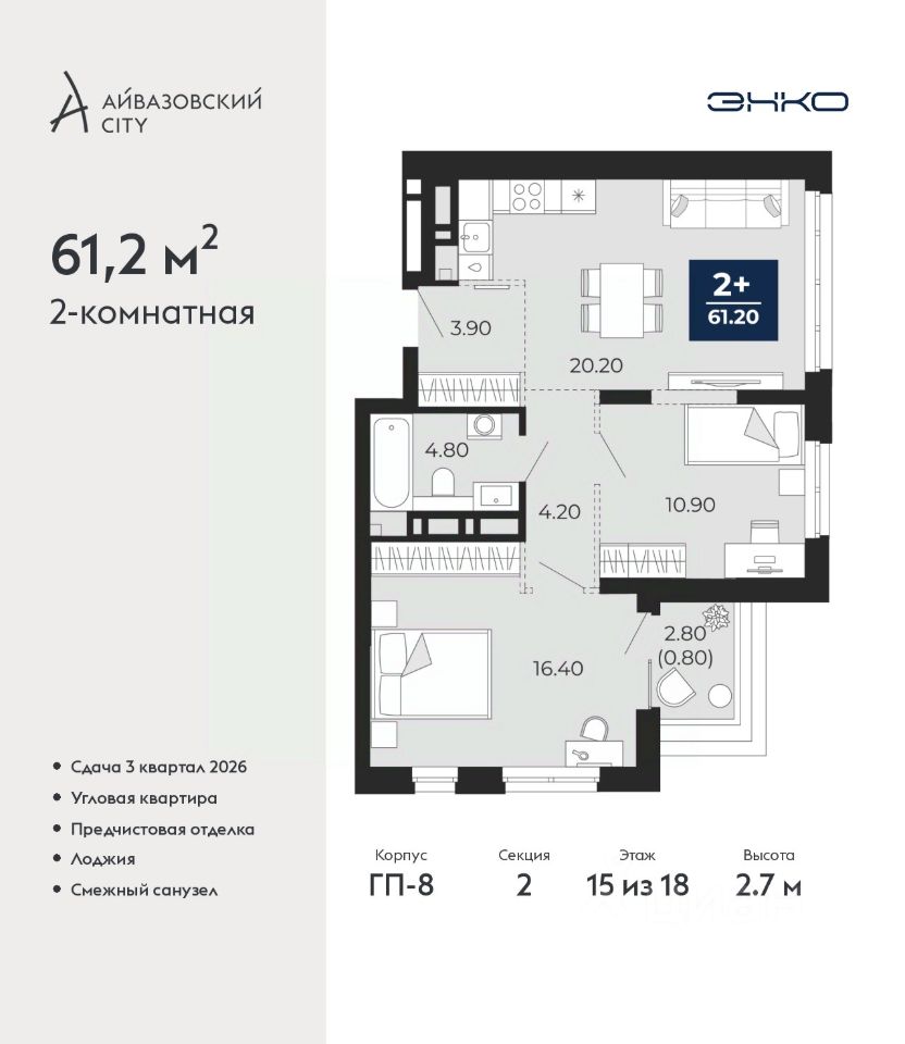 Двухкомнатная квартира с предчистовой отделкой в ЖК ''Айвазовский City'' на 15 этаже. Общая площадь: 61.2 кв.м., жилая: 27.3 кв.м., площадь просторной кухни-столовой: 20.2 кв.м. Угловая квартира, идеально подойдет любителям тишины и панорамных видов. В квартире одна лоджия, один совмещенный санузел. Высота потолков 2.7 м.