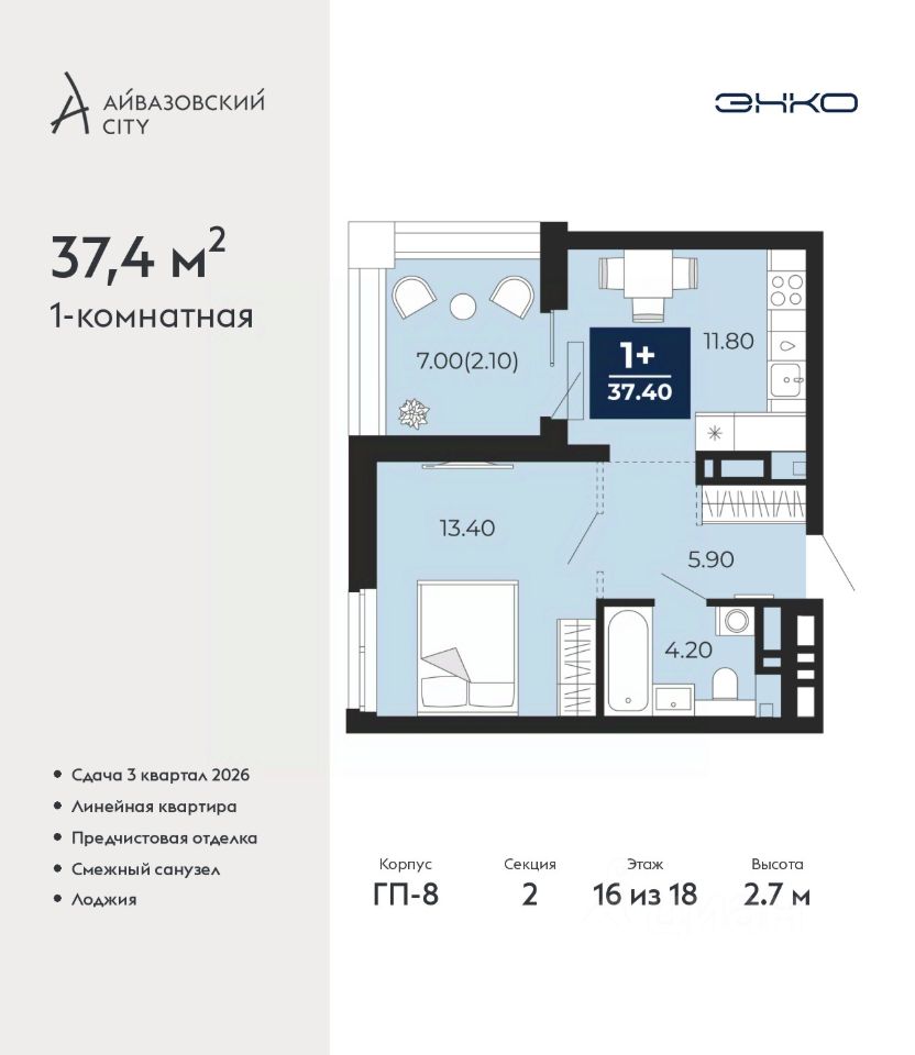 1-комн. квартира с предчистовой отделкой в ЖК ''Айвазовский City'' на 16 этаже. Общая площадь: 37.4 кв.м., жилая: 13.4 кв.м., площадь просторной кухни-столовой: 11.8 кв.м. Все окна выходят на одну сторону. В квартире одна лоджия, один совмещенный санузел. Наличие террасы в квартире открывает возможность для создания зон отдыха в кругу семьи и друзей. Высота потолков 2.7 м.