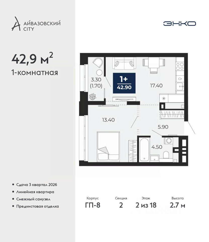 1-комн. квартира с предчистовой отделкой в ЖК ''Айвазовский City'' на 2 этаже. Общая площадь: 42.9 кв.м., жилая: 12.5 кв.м., площадь просторной кухни-столовой: 21.8 кв.м. Все окна выходят на одну сторону. В квартире один совмещенный санузел. Высота потолков 2.7 м.