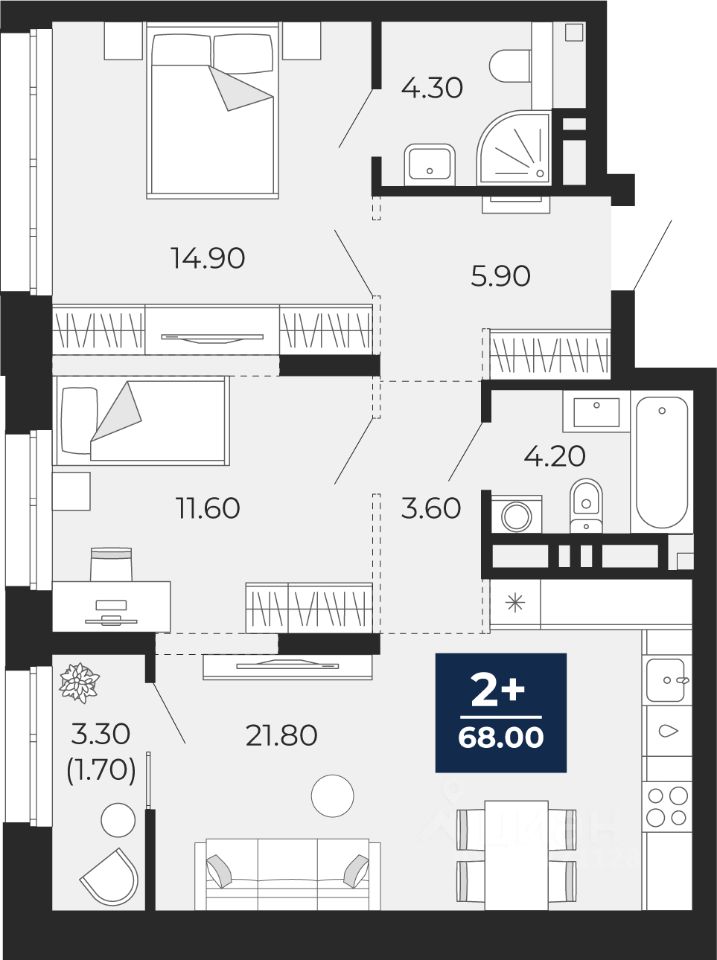 Продается двухкомнатная квартира с предчистовой отделкой в ЖК ''Айвазовский City'' на 9 этаже. Общая площадь: 68 кв.м., жилая: 26.5 кв.м., площадь просторной кухни-столовой: 21.8 кв.м. Комнаты изолированные, все окна выходят на одну сторону. В квартире одна лоджия, два совмещенных санузла. Высота потолков 2.7 м.