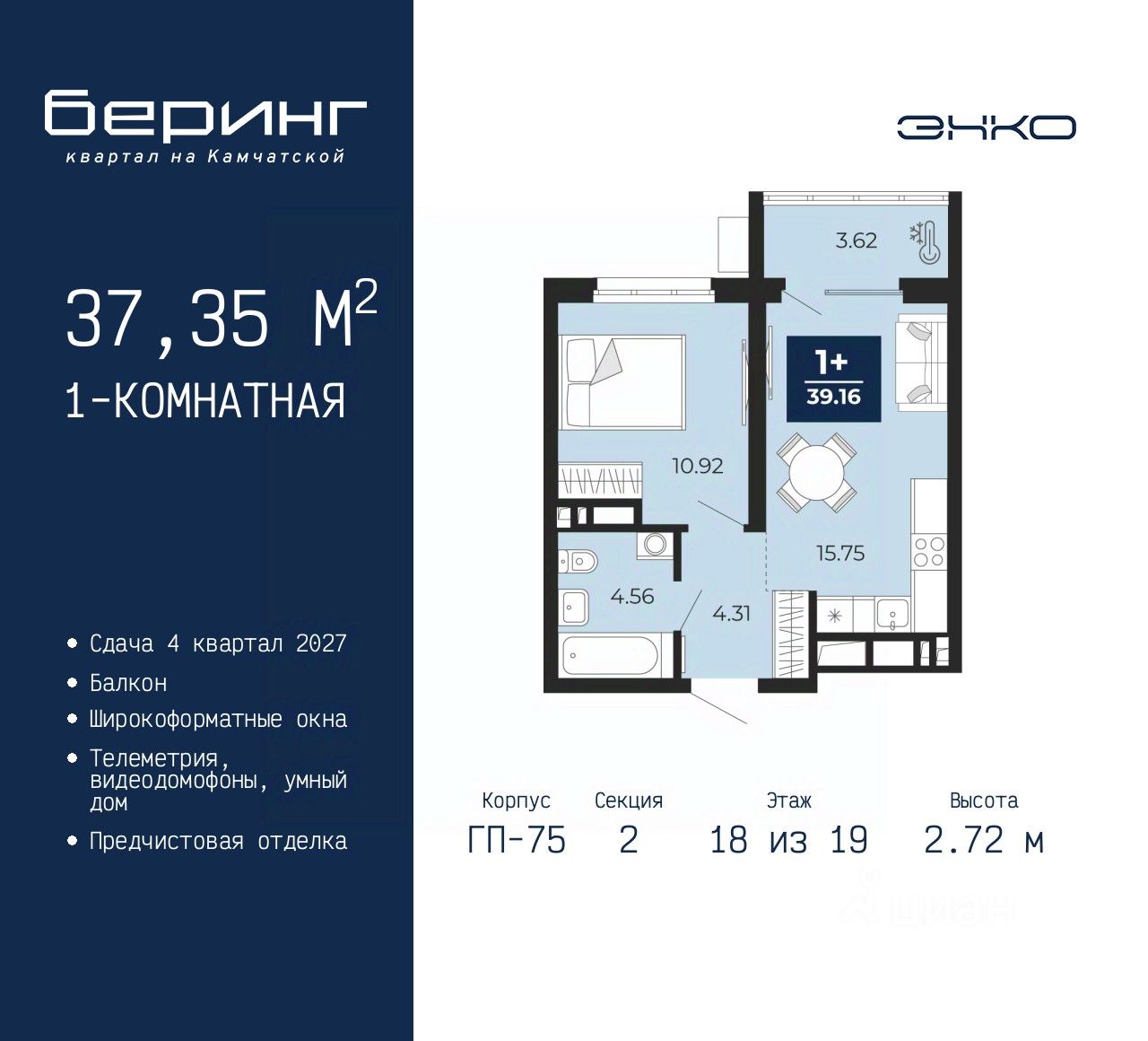 1-комн. квартира с предчистовой отделкой в ЖК ''Беринг'' на 18 этаже. Общая площадь: 37.35 кв.м., жилая: 10.92 кв.м., площадь просторной кухни-столовой: 15.02 кв.м. Все окна выходят на одну сторону. В квартире один балкон, один совмещенный санузел. Высота потолков 2.72 м.