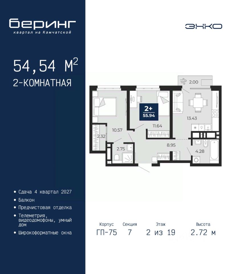 Просторная 2-комн. квартира с предчистовой отделкой в ЖК ''Беринг'' на 2 этаже. Общая площадь: 54.54 кв.м., жилая: 22.21 кв.м., площадь просторной кухни-столовой: 13.43 кв.м. Комнаты изолированные, все окна выходят на одну сторону. В квартире один балкон, два совмещенных санузла. Высота потолков 2.72 м.