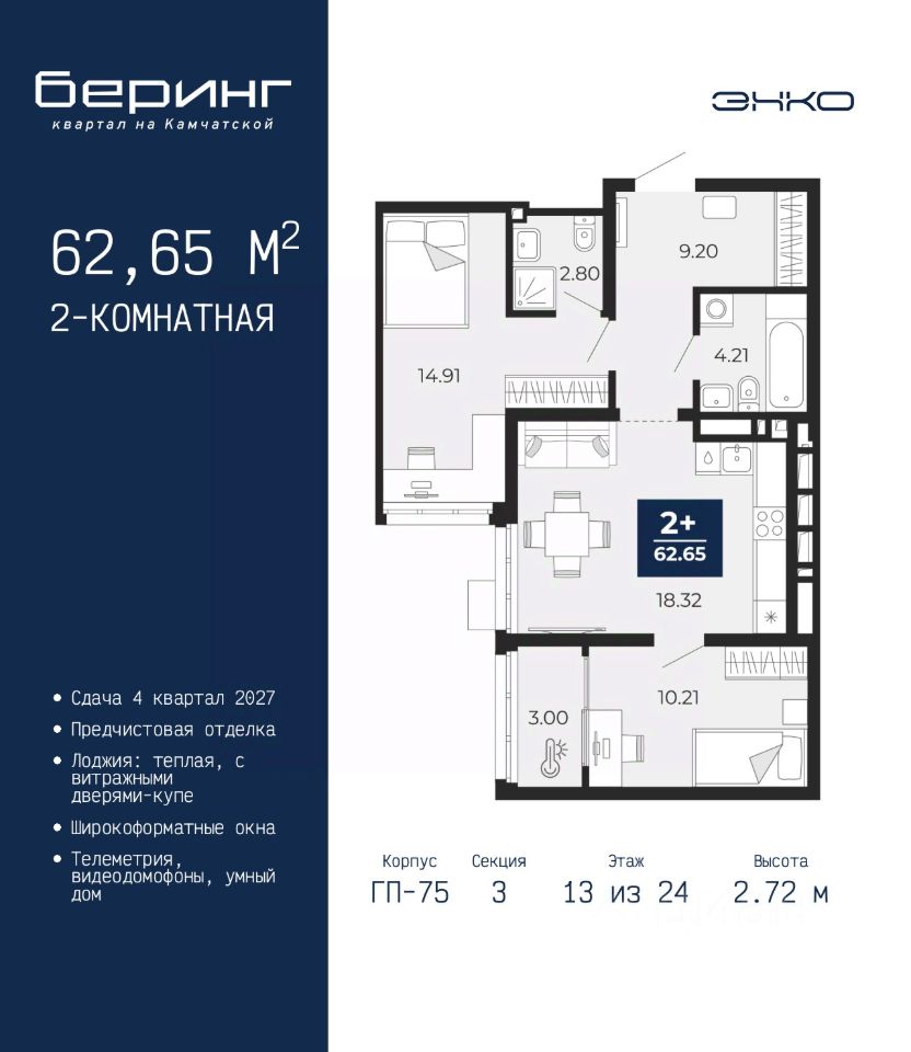 2-комн. квартира от застройщика с предчистовой отделкой в ЖК ''Беринг'' на 13 этаже. Общая площадь: 62.65 кв.м., жилая: 25.12 кв.м., площадь просторной кухни-столовой: 18.32 кв.м. Комнаты изолированные, все окна выходят на одну сторону. В квартире одна лоджия, два совмещенных санузла. Высота потолков 2.72 м.