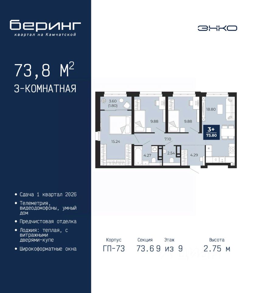 3-комн. квартира от застройщика с предчистовой отделкой в ЖК ''Беринг'' на 9 этаже. Общая площадь: 73.8 кв.м., жилая: 35 кв.м., площадь просторной кухни-столовой: 18.8 кв.м. Угловая квартира, очень светлая, естественная вентиляция при открытии окон. В квартире одна лоджия, один совмещенный и один раздельный санузел. Высота потолков 2.75 м.