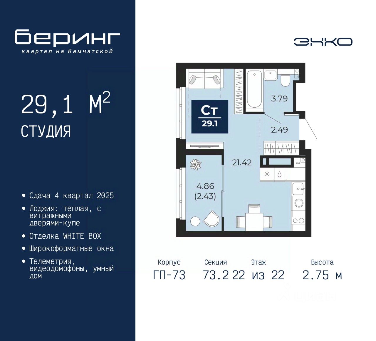 1-комн. квартира-студия с предчистовой отделкой в ЖК ''Беринг'' на 22 этаже. Общая площадь: 29.1 кв.м., площадь гостиной 21.42 кв.м., из которых 5 кв.м. выделено под кухонную зону. Все окна выходят на одну сторону. В квартире одна лоджия, один совмещенный санузел. Высота потолков 2.75 м.