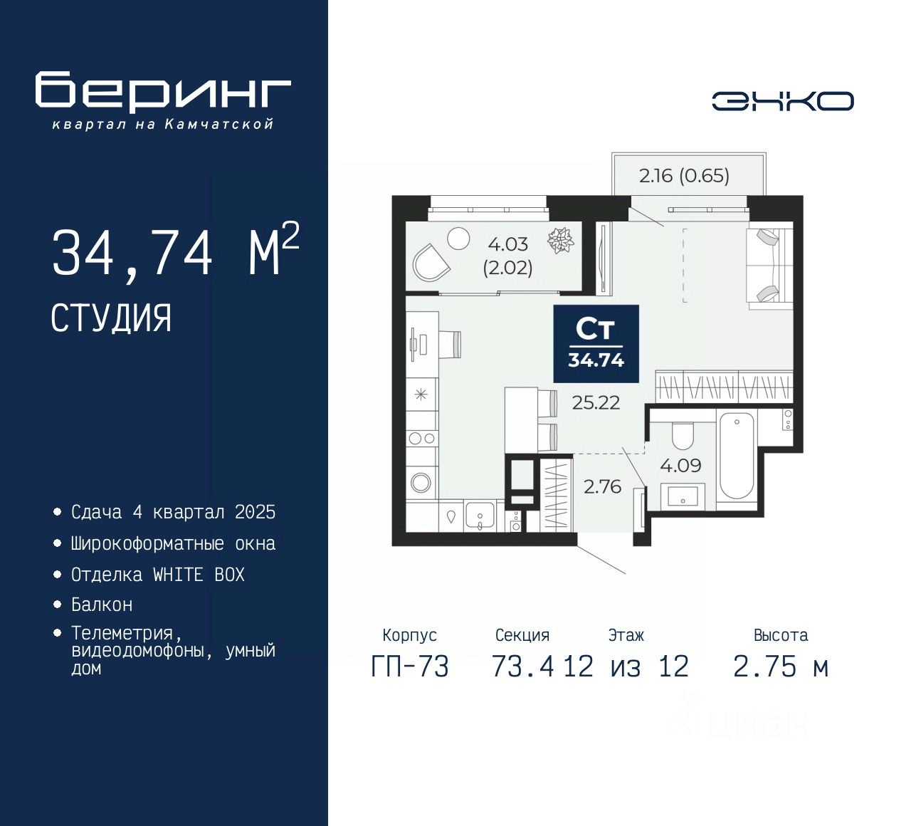 Продается 1-комн. квартира-студия с предчистовой отделкой в ЖК ''Беринг'' на 12 этаже. Общая площадь: 34.74 кв.м., площадь гостиной 25.22 кв.м., из которых 5 кв.м. выделено под кухонную зону. Все окна выходят на одну сторону. В квартире один балкон, один совмещенный санузел. Высота потолков 2.75 м.