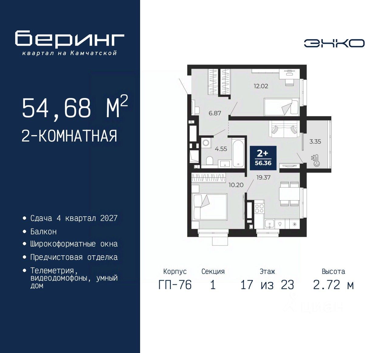 Просторная двухкомнатная квартира с предчистовой отделкой в ЖК ''Беринг'' на 17 этаже. Общая площадь: 54.68 кв.м., жилая: 22.22 кв.м., площадь просторной кухни-столовой: 19.37 кв.м. Угловая квартира, идеально подойдет любителям тишины и панорамных видов. В квартире один балкон, один совмещенный санузел. Высота потолков 2.72 м.