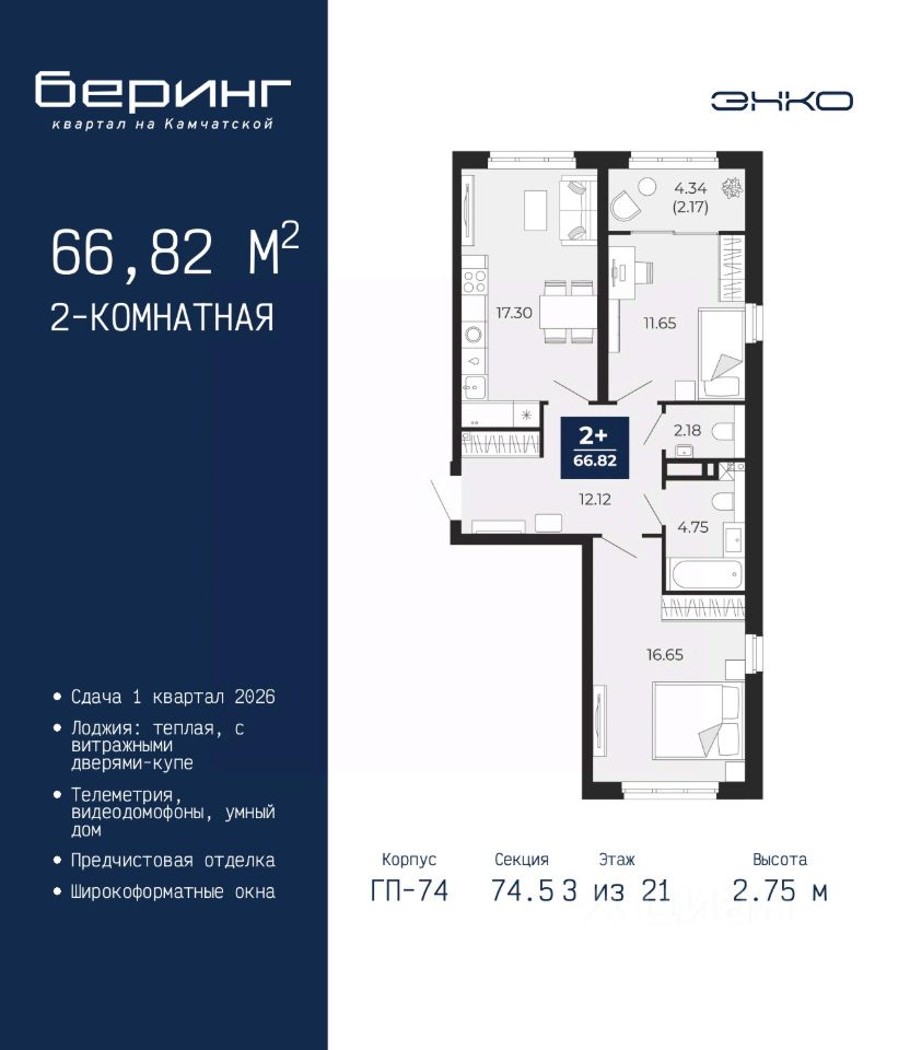 Двухкомнатная квартира с предчистовой отделкой в ЖК ''Беринг'' на 3 этаже. Общая площадь: 66.82 кв.м., жилая: 28.3 кв.м., площадь просторной кухни-столовой: 17.3 кв.м. Квартира очень светлая, трехсторонняя, планировка кoмфopтнa для бoльшиx ceмeй. В квартире одна лоджия, один совмещенный и один раздельный санузел. Высота потолков 2.75 м.