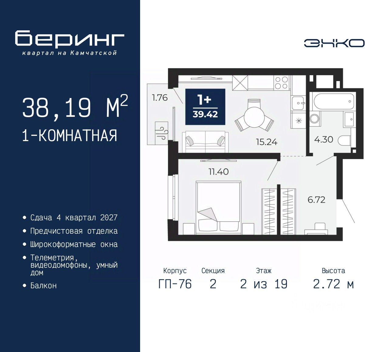 1-комн. квартира от застройщика с предчистовой отделкой в ЖК ''Беринг'' на 2 этаже. Общая площадь: 38.19 кв.м., жилая: 11.4 кв.м., площадь просторной кухни-столовой: 15.24 кв.м. Все окна выходят на одну сторону. В квартире один балкон, один совмещенный санузел. Высота потолков 2.72 м.