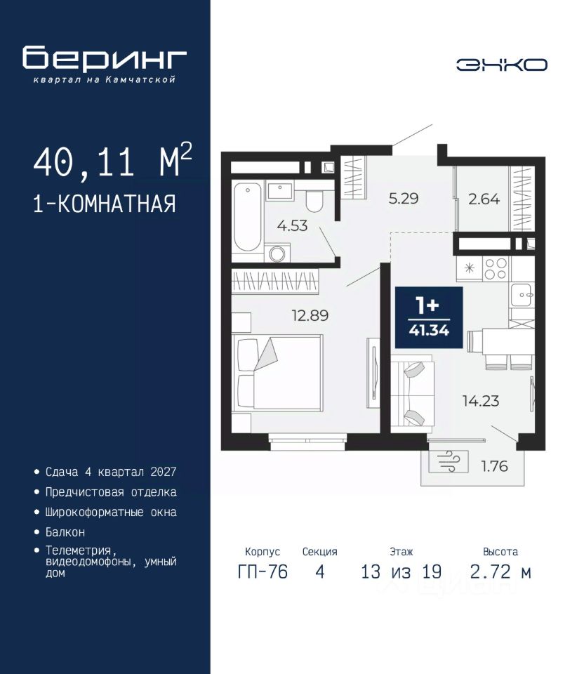 Просторная 1-комн. квартира с предчистовой отделкой в ЖК ''Беринг'' на 13 этаже. Общая площадь: 40.11 кв.м., жилая: 12.89 кв.м., площадь просторной кухни-столовой: 14.23 кв.м. Все окна выходят на одну сторону. В квартире один балкон, один совмещенный санузел. Высота потолков 2.72 м.