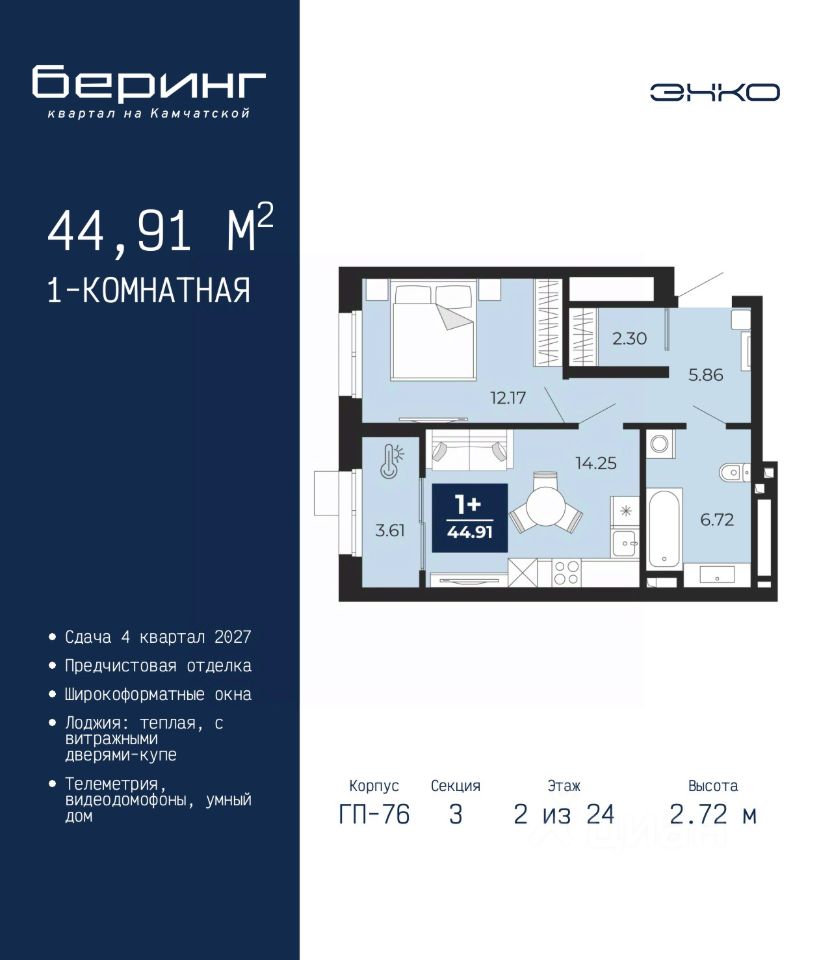 1-комн. квартира от застройщика с предчистовой отделкой в ЖК ''Беринг'' на 2 этаже. Общая площадь: 44.91 кв.м., жилая: 12.17 кв.м., площадь просторной кухни-столовой: 14.25 кв.м. Все окна выходят на одну сторону. В квартире одна лоджия, один совмещенный санузел. Высота потолков 2.72 м.