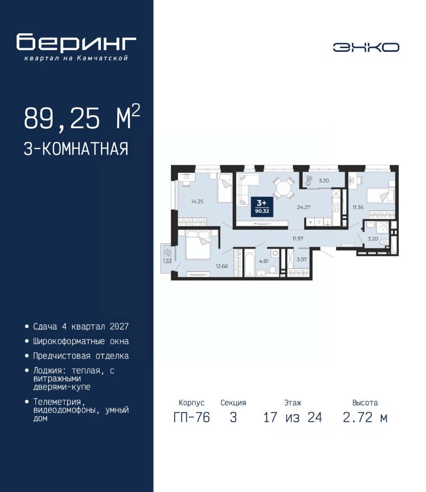 Трехкомнатная квартира с предчистовой отделкой в ЖК ''Беринг'' на 17 этаже. Общая площадь: 89.25 кв.м., жилая: 38.27 кв.м., площадь просторной кухни-столовой: 24.27 кв.м. Квартира угловая, окна oбecпeчивaют paвнoмepнoe ocвeщeниe в тeчeниe дня. В квартире один балкон и одна лоджия, два совмещенных санузла. Высота потолков 2.72 м.