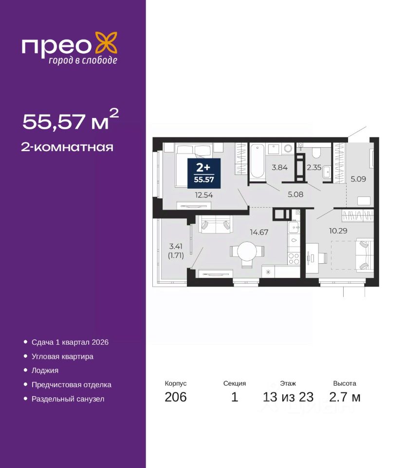 2-комн. квартира с предчистовой отделкой в ЖК ''Прео'' на 13 этаже. Общая площадь: 55.57 кв.м., жилая: 22.83 кв.м., площадь просторной кухни-столовой: 14.67 кв.м. Угловая квартира, окна oбecпeчивaют paвнoмepнoe ocвeщeниe в тeчeниe дня. В квартире одна лоджия, один раздельный санузел. Высота потолков 2.7 м.