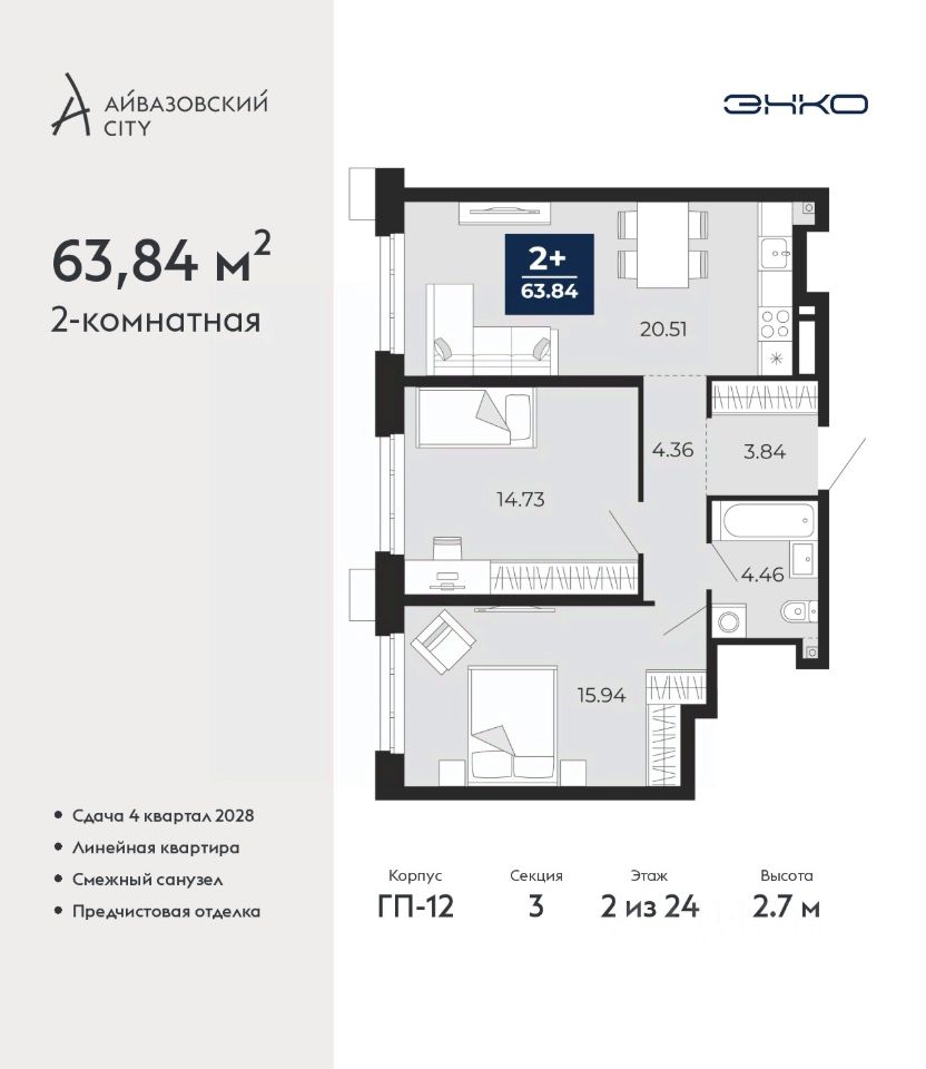 Двухкомнатная квартира с предчистовой отделкой в ЖК ''Айвазовский City'' на 2 этаже. Общая площадь: 63.84 кв.м., жилая: 30.67 кв.м., площадь просторной кухни-столовой: 20.51 кв.м. Комнаты изолированные, все окна выходят на одну сторону. В квартире один совмещенный санузел. Высота потолков 2.7 м.