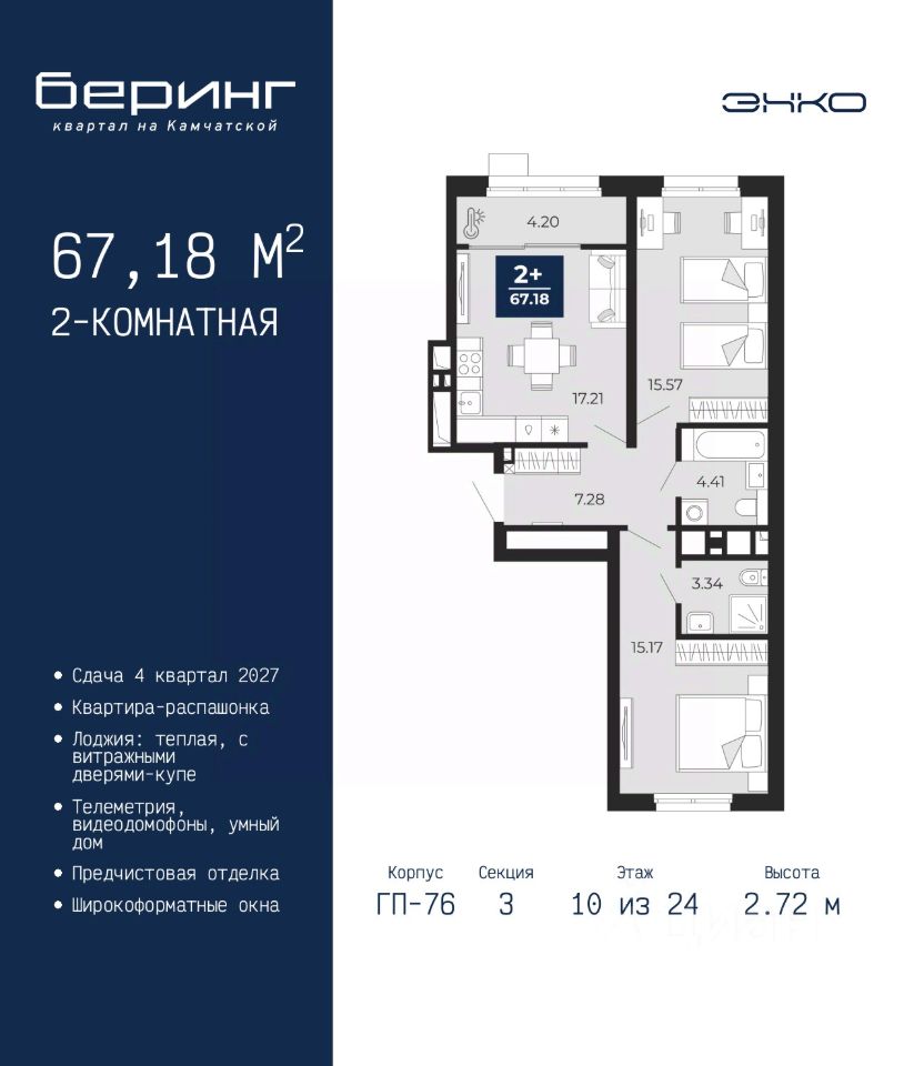 Двухкомнатная квартира от застройщика с предчистовой отделкой в ЖК ''Беринг'' на 10 этаже. Общая площадь: 67.18 кв.м., жилая: 30.74 кв.м., площадь просторной кухни-столовой: 17.21 кв.м. Квартира - распашонка, без проходных комнат, окна выходят на paзные стороны дома. В квартире одна лоджия, два совмещенных санузла. Высота потолков 2.72 м.