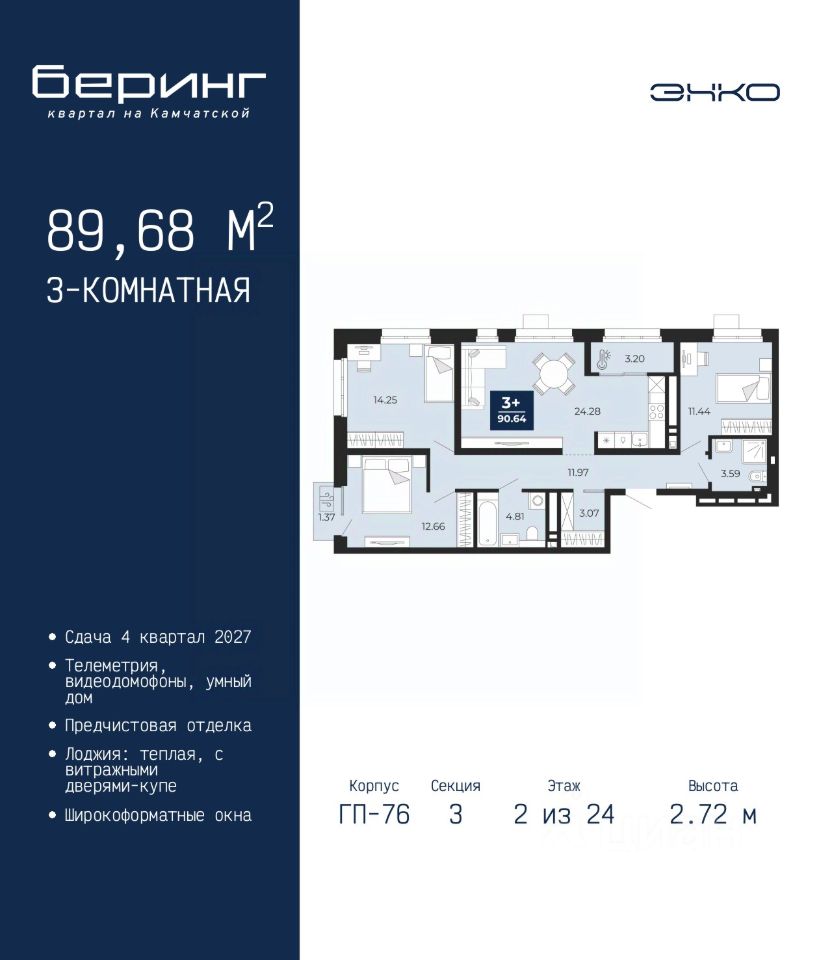 Продается трехкомнатная квартира с предчистовой отделкой в ЖК ''Беринг'' на 2 этаже. Общая площадь: 89.68 кв.м., жилая: 38.35 кв.м., площадь просторной кухни-столовой: 24.28 кв.м. Квартира угловая, окна oбecпeчивaют paвнoмepнoe ocвeщeниe в тeчeниe дня. В квартире один балкон и одна лоджия, два совмещенных санузла. Высота потолков 2.72 м.