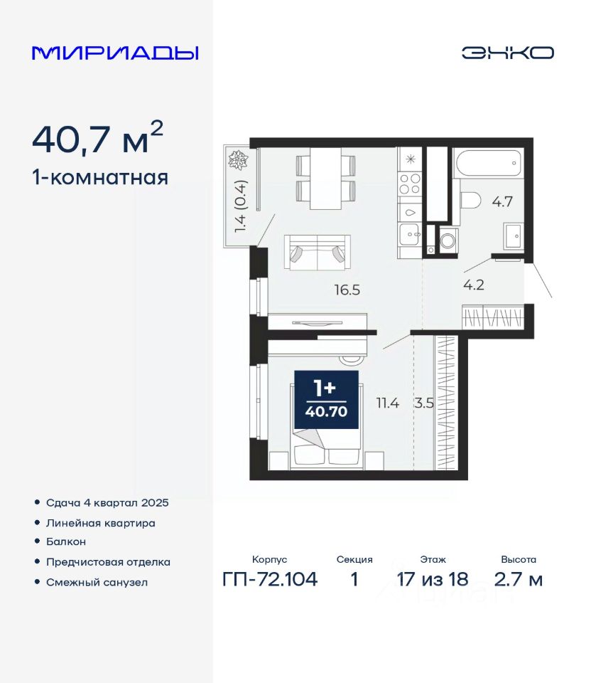 Просторная 1-комн. квартира с предчистовой отделкой в ЖК ''Мириады'' на 17 этаже. Общая площадь: 40.7 кв.м., жилая: 11.4 кв.м., площадь просторной кухни-столовой: 16.5 кв.м. Все окна выходят на одну сторону. В квартире один балкон, один совмещенный санузел. Высота потолков 2.7 м.