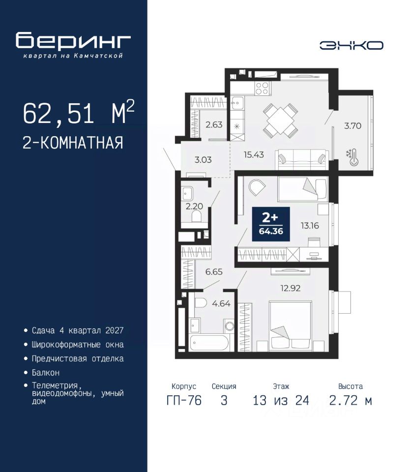 2-комн. квартира с предчистовой отделкой в ЖК ''Беринг'' на 13 этаже. Общая площадь: 62.51 кв.м., жилая: 26.08 кв.м., площадь просторной кухни-столовой: 15.43 кв.м. Комнаты изолированные, все окна выходят на одну сторону. В квартире один балкон, один совмещенный и один раздельный санузел. Высота потолков 2.72 м.